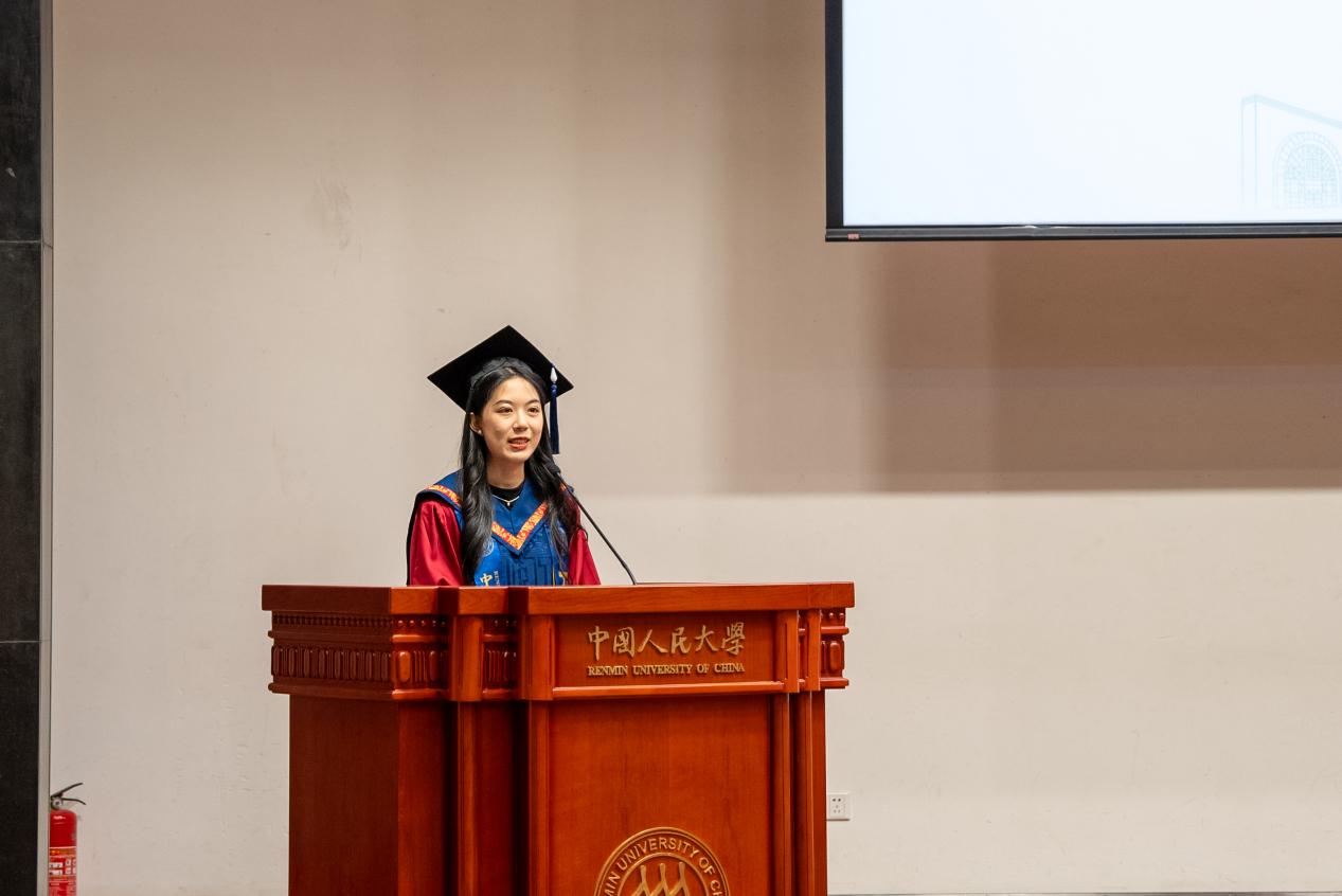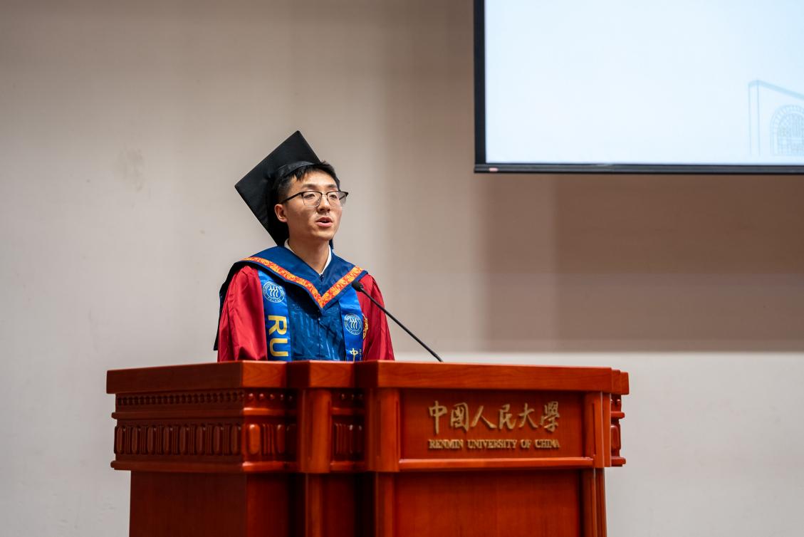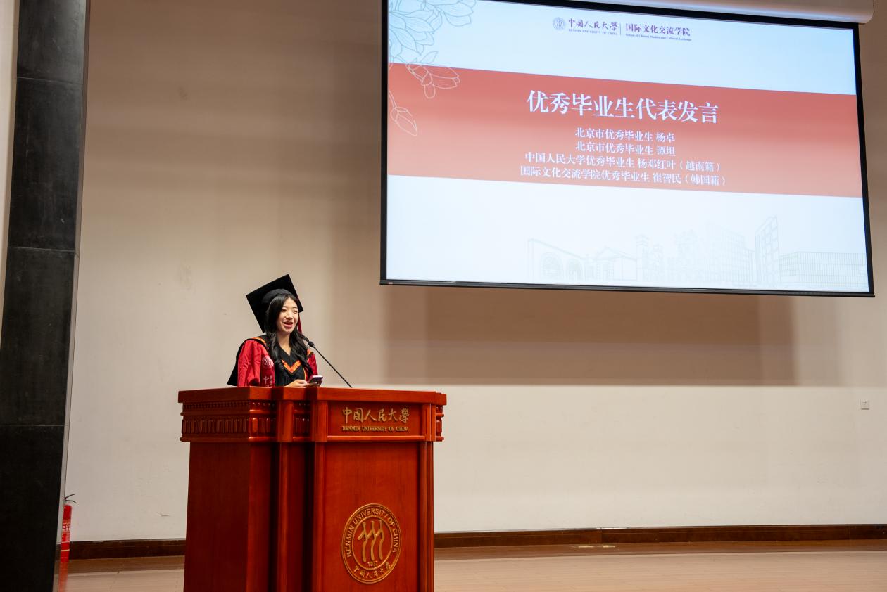 北京市级优秀毕业生2022级汉语国际教育硕士1班学生代表杨卓用最朴实的语言,讲述了从苏州校区开学至今的成长印记。春日教室的第一次见面,夏夜荷塘边的葫芦丝悠扬,红旗下庄严宣誓的那一刻,以及小组讨论时迸发的思想火花,每一个瞬间都见证了他的蜕变。在这里,他不仅夯实了专业功底,更从“强国先锋、复兴栋梁”的使命召唤中,汲取了无限动力。此刻,他心怀感恩,将最深的敬意献给悉心教导的老师和孕育梦想的母校;未来,他将继续以“人大人”的身份,把中国文化的魅力带向世界。