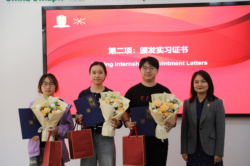 尹楠楠总监为首批实习教师崔海心、苗晶、张浩坤颁发了聘书。张浩坤代表实习教师发言,表示希望将理论与实践结合,成长为有温度、有实力的中文教师,以青春与热情书写文明互鉴的故事。
